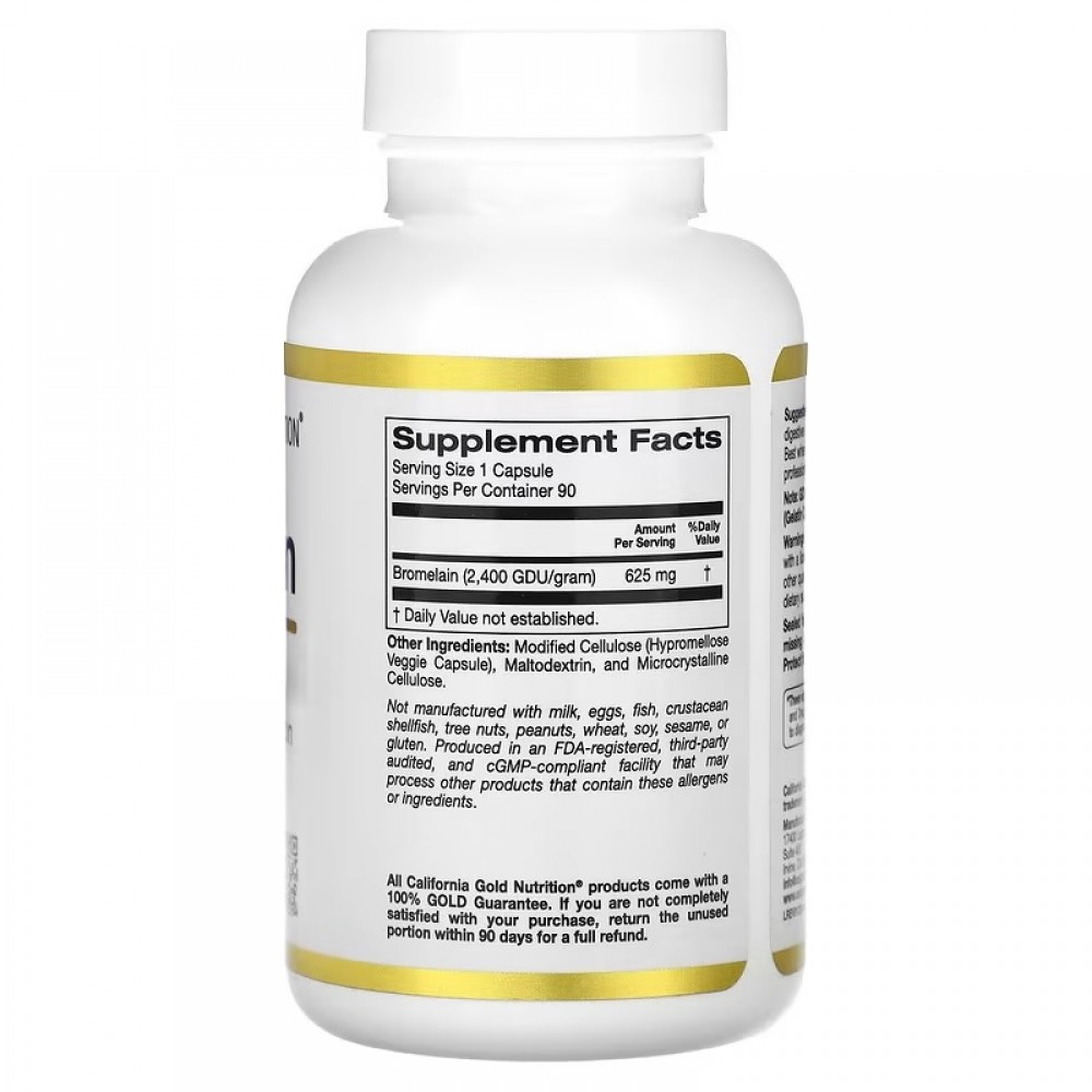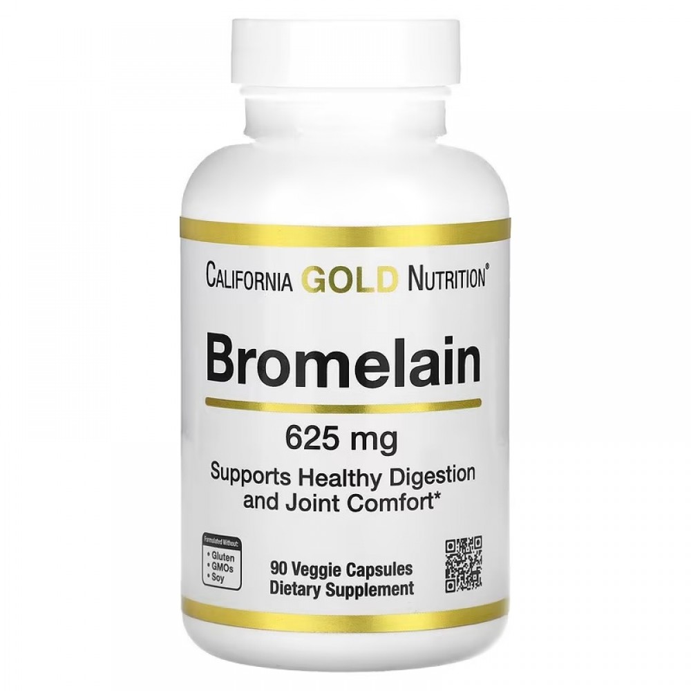 Продукт от California Gold Nutrition содержит бромелаин, извлеченный из плодов и стеблей ананаса. Он подходит как для вегетарианцев, так и для веганов и не содержит глютена, ГМО и сои. Одна упаковка рассчитана на прием в течение трех месяцев (при соблюдении рекомендованной дозы).