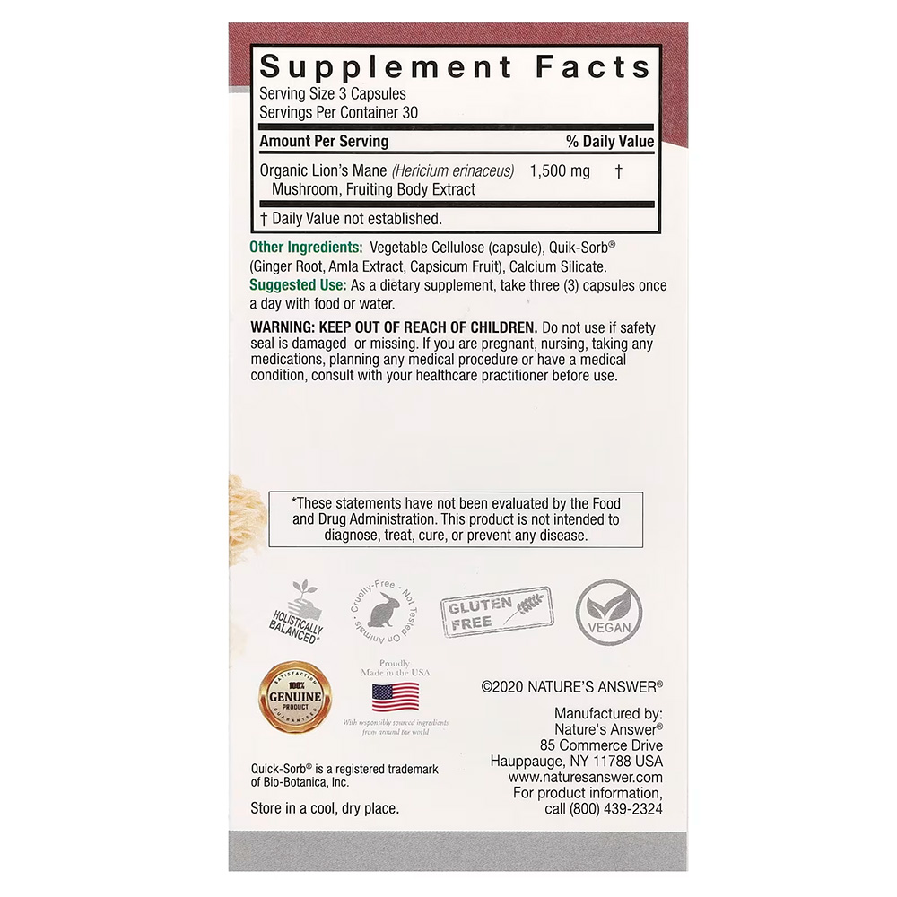 Ежовик гребенчатый (Hericium erinaceus) — поразительный гриб! Он растет на пнях и бревнах в Северной Америке, Азии и Европе и обычно встречается в конце лета и осенью. Традиционная китайская медицина использовала этот вид грибов из-за его полезных свойств и для поддержания «ци», жизненной энергии человека. Современная наука изучает способность этого гриба поддерживать когнитивные функции, а также здоровый иммунный ответ. Ежовик гребенчатый от Nature's Answer® — это чистый органический порошок из ежовика гребенчатого в веганской капсуле без стеарата магния, который дополнительно усилен Quick-Sorb®, уникальной смесью Nature's Answer®, состоящей из имбиря, плодов амлы и перца для лучшего усвоения.