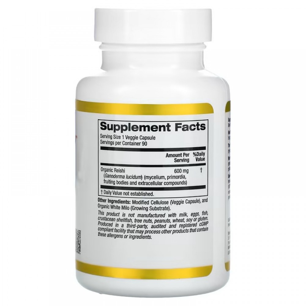 Рейши от Fungiology California Gold Nutrition производится из органических грибов полного спектра, которые выращиваются и упаковываются в США. Полный спектр грибов состоит из мицелия, проспор, плодовых тел и природных внеклеточных соединений.