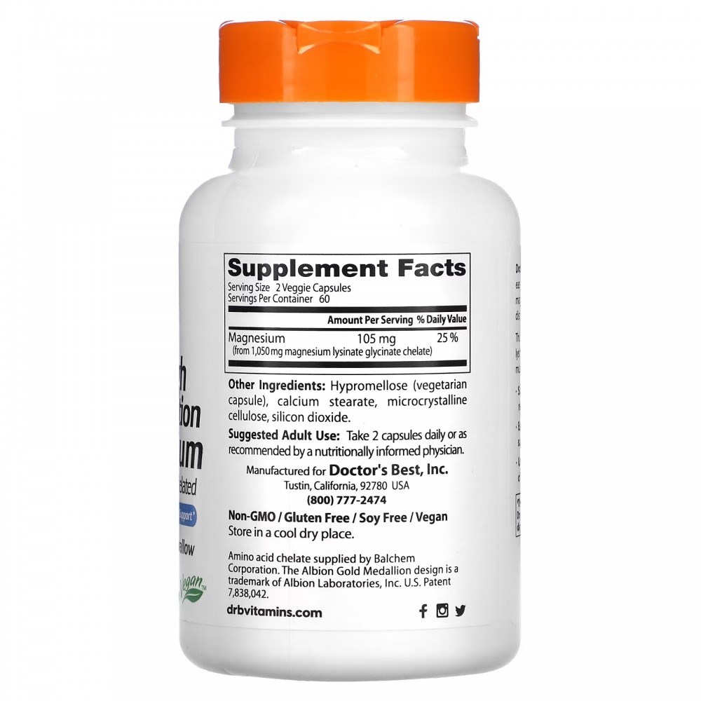 Магний от Doctor's Best обеспечивает ежедневную дозу магния, которую легко глотать, с высокой степенью усвояемости, который не вызывает проблем со стороны желудочно-кишечного тракта.