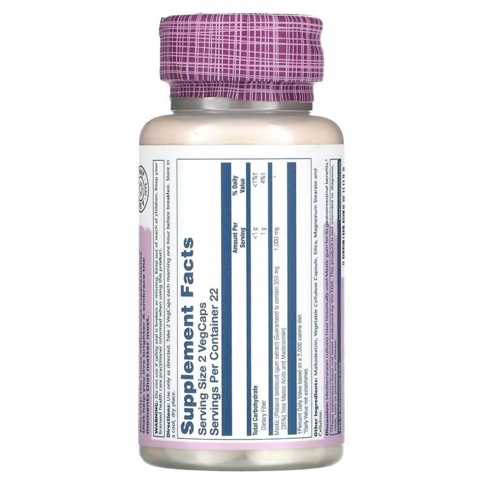 | Мастиковая смола (Pistacia lentiscus) (экстракт камеди) (гарантированно содержит 350 мг [35%] общего количества мастиковых кислот и смолы) | 1000 мг | * |