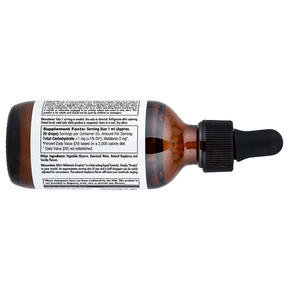 Мелатонин KAL® Melatonin DropIns™ — это быстродействующее жидкое средство. Просто принимайте DropIns в виде капель перорально. Приблизительный размер порции (полторы пипетки) можно легко отрегулировать для удобства. Натуральный вкус малины точно придётся вам по душе.