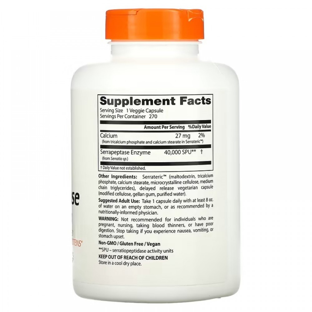 Серрапептаза (серратиопептидаза) — это фермент, переваривающий белок, выделенный из полезной бактерии Serratia E-15, обнаруженной у японского тутового шелкопряда, которая уже более трех десятилетий используется в Европе и Азии в качестве пищевой добавки. Серрапептаза от Doctor's Best с 40 000 SPU содержит Serrateric™ — высокоэффективный состав с кишечнорастворимым покрытием, которое защищает отдельные ферменты до тех пор, пока они не достигнут кишечника, обеспечивая оптимальное всасывание.