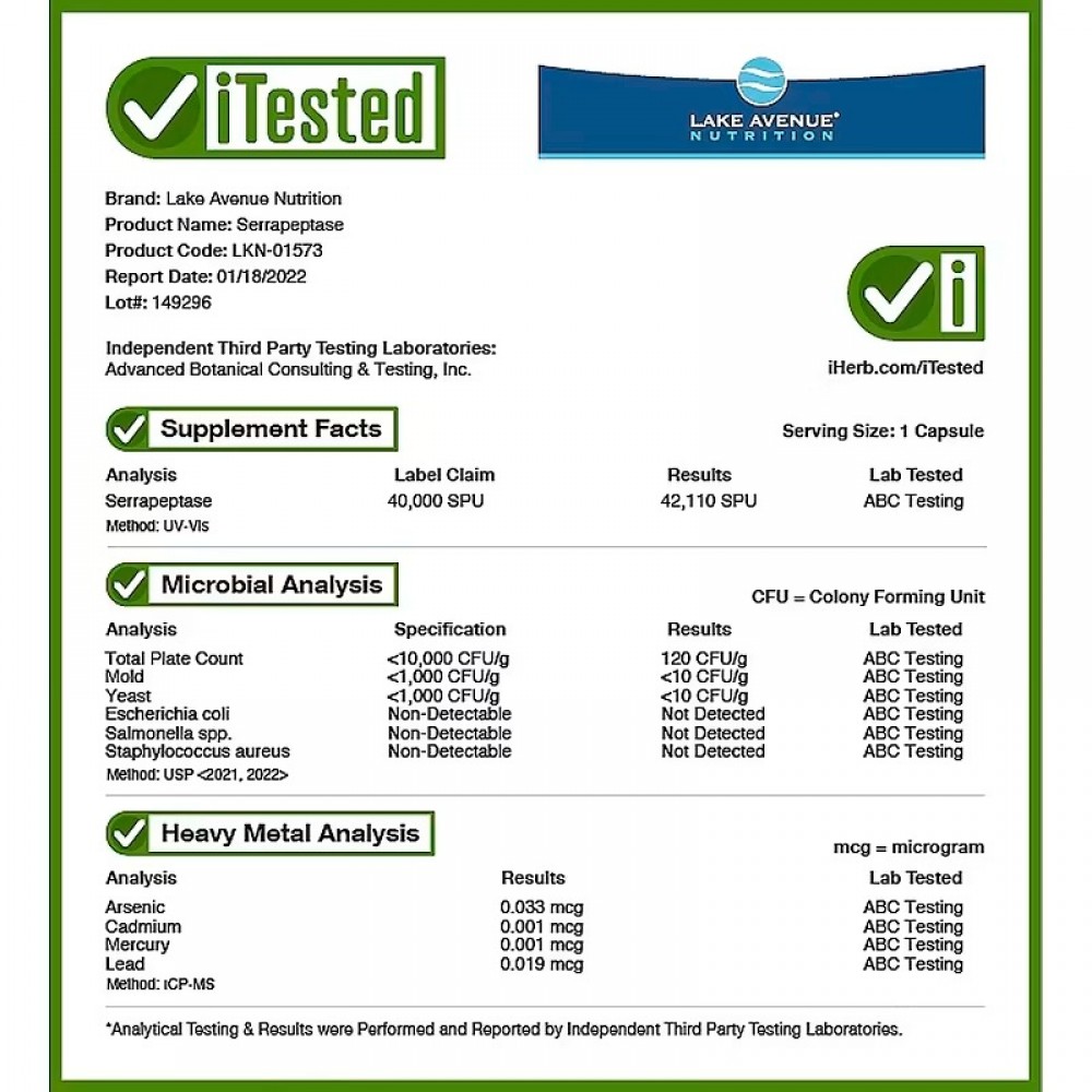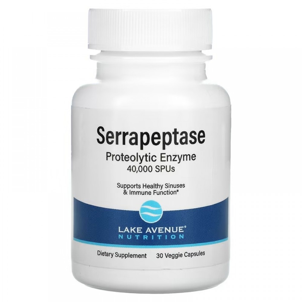 Серрапептаза от Lake Avenue Nutrition содержит серрапептазу вида из Serratio. Добавка подходит для вегетарианцев, не содержит глютена и ГМО. Одна упаковка рассчитана на прием в течение одного месяца (при соблюдении рекомендованной дозы).
