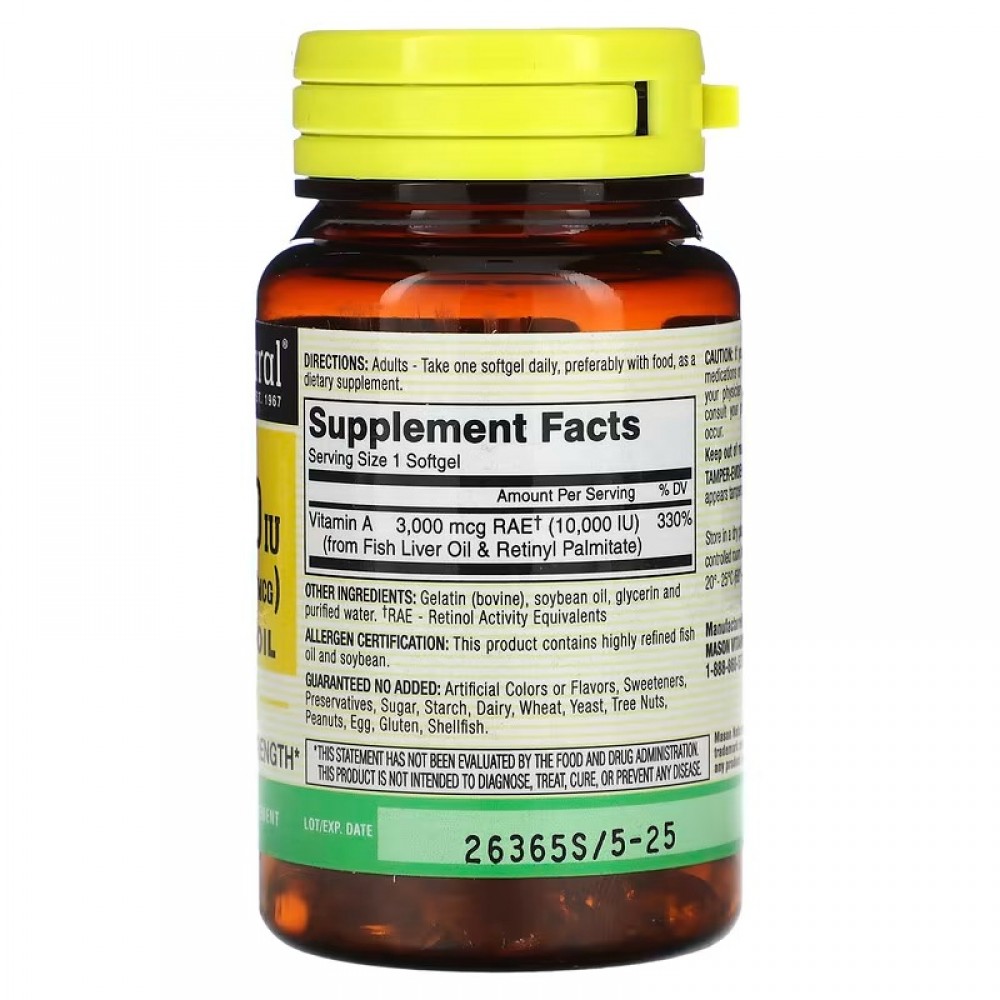 Mason Natural, витамин A из жира печени рыбы, 3000 мкг (10 000 МЕ), 100 капсул