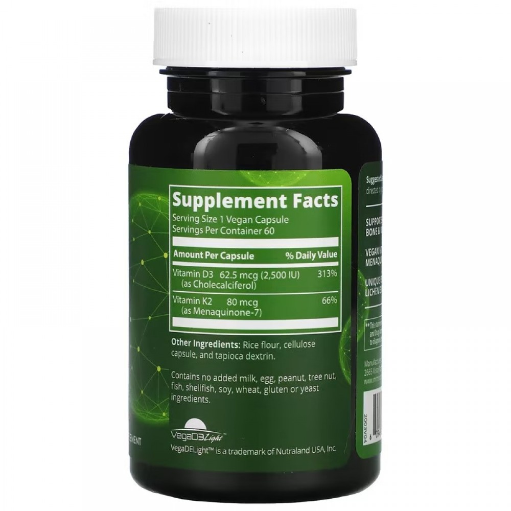 Этот уникальный витамин D3 в микрокапсулах (холекальциферол), разработанный для веганов, извлекается из лишайников и не содержит ГМО (подтверждено сертификатом Non GMO Project Verified). Клинические данные подтверждают, что натуральный витамин D3 более эффективен, чем другие формы (например, D2). Витамин D3 необходим для эффективного использования кальция, который, в свою очередь, помогает формировать и поддерживать крепкие здоровые кости. Кроме того, витамин D3 поддерживает здоровье иммунной системы. Менахинон-7 витамина K2 является наиболее эффективной формой добавки. Веганский витамин K2 дополняет и уравновешивает витамин D3, а также сводит к минимуму кальцификацию, не связанную с костями.