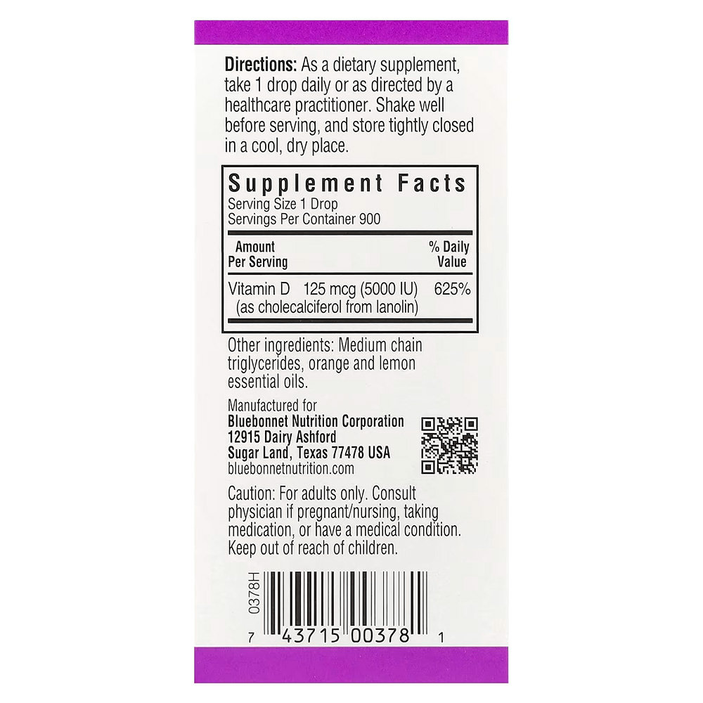 Bluebonnet Nutrition, капли витамина D3, с натуральным цитрусовым вкусом, 5000 МЕ, 30 мл (1 жидкая унция)