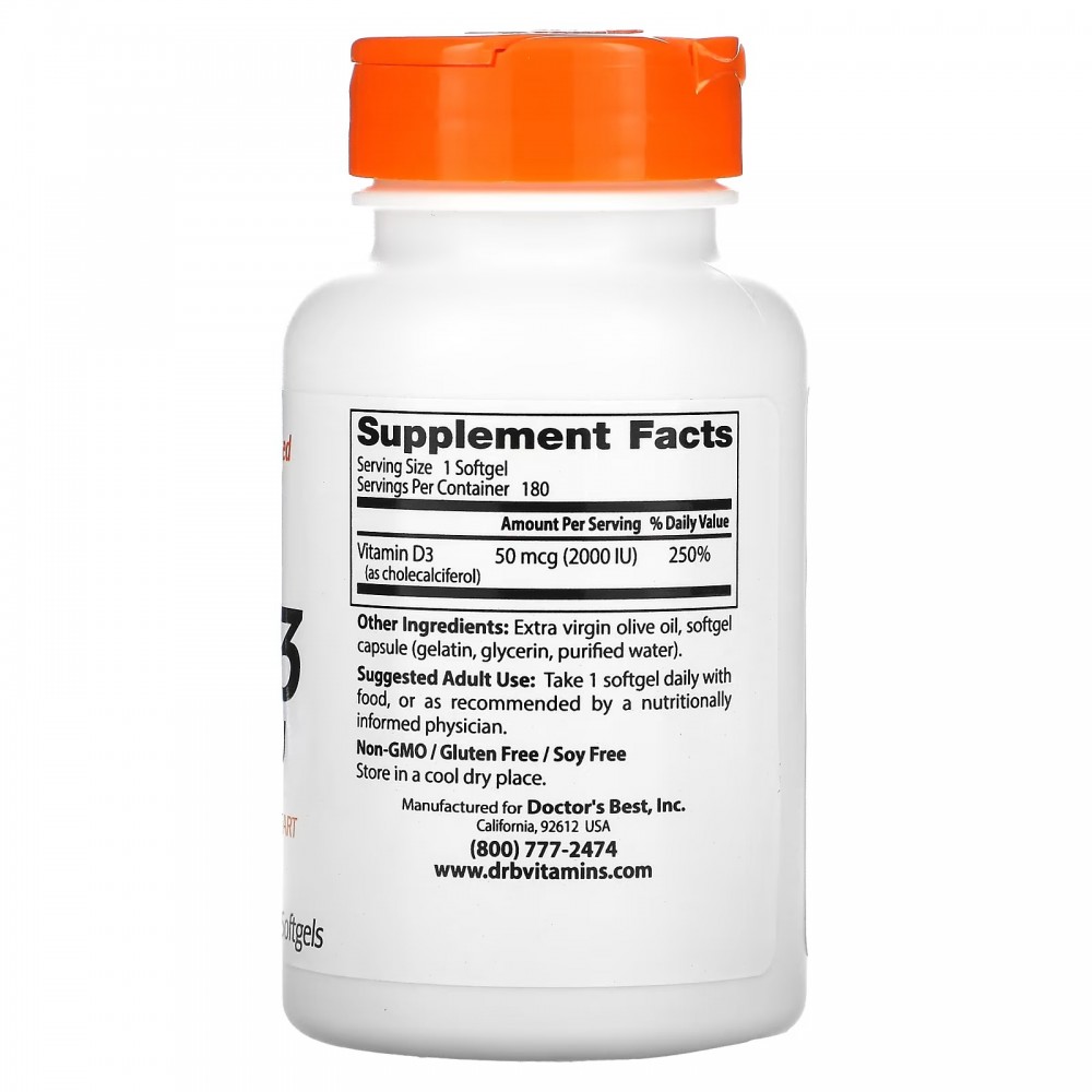 Doctor's Best, витамин D3, 50 мкг (2000 МЕ), 180 капсул
