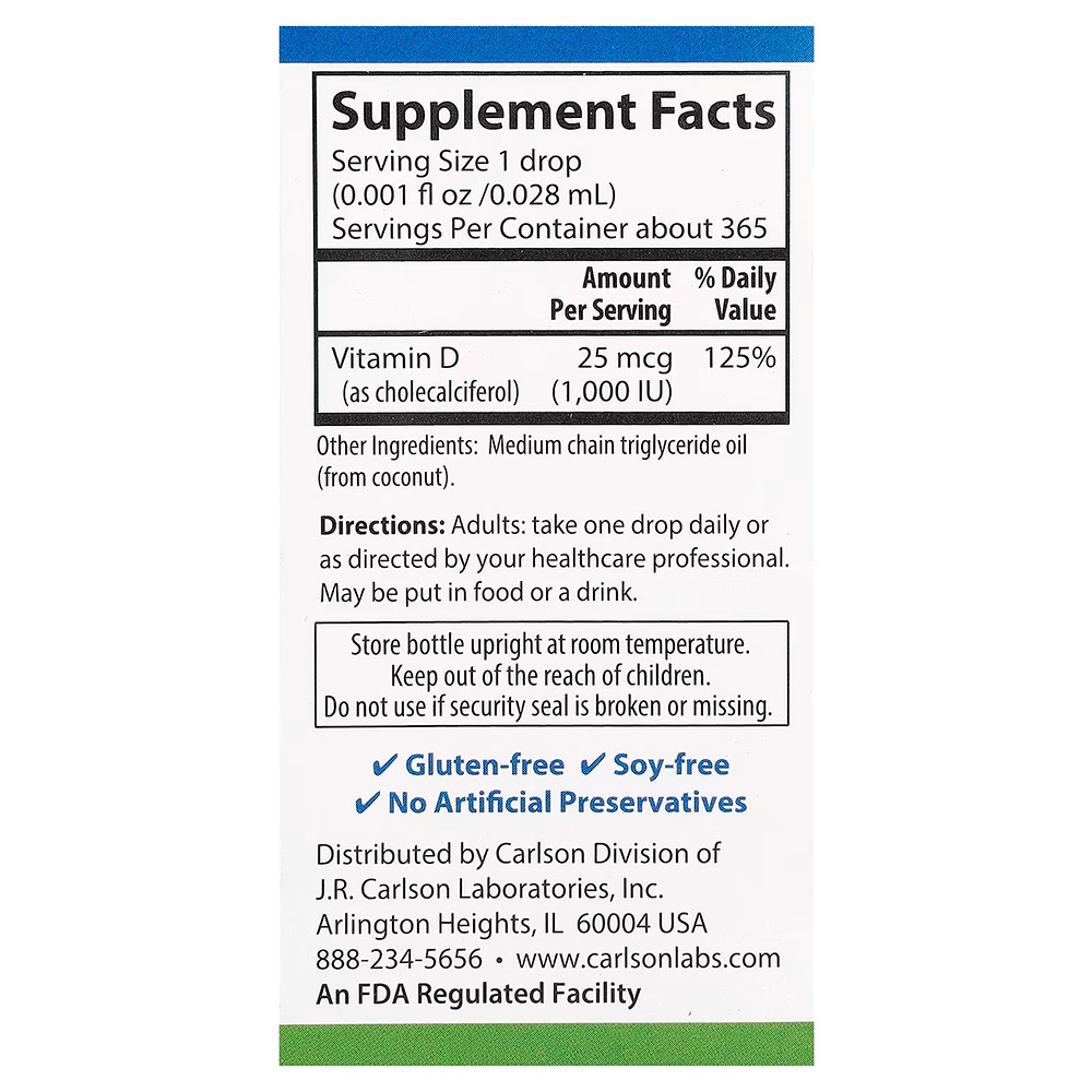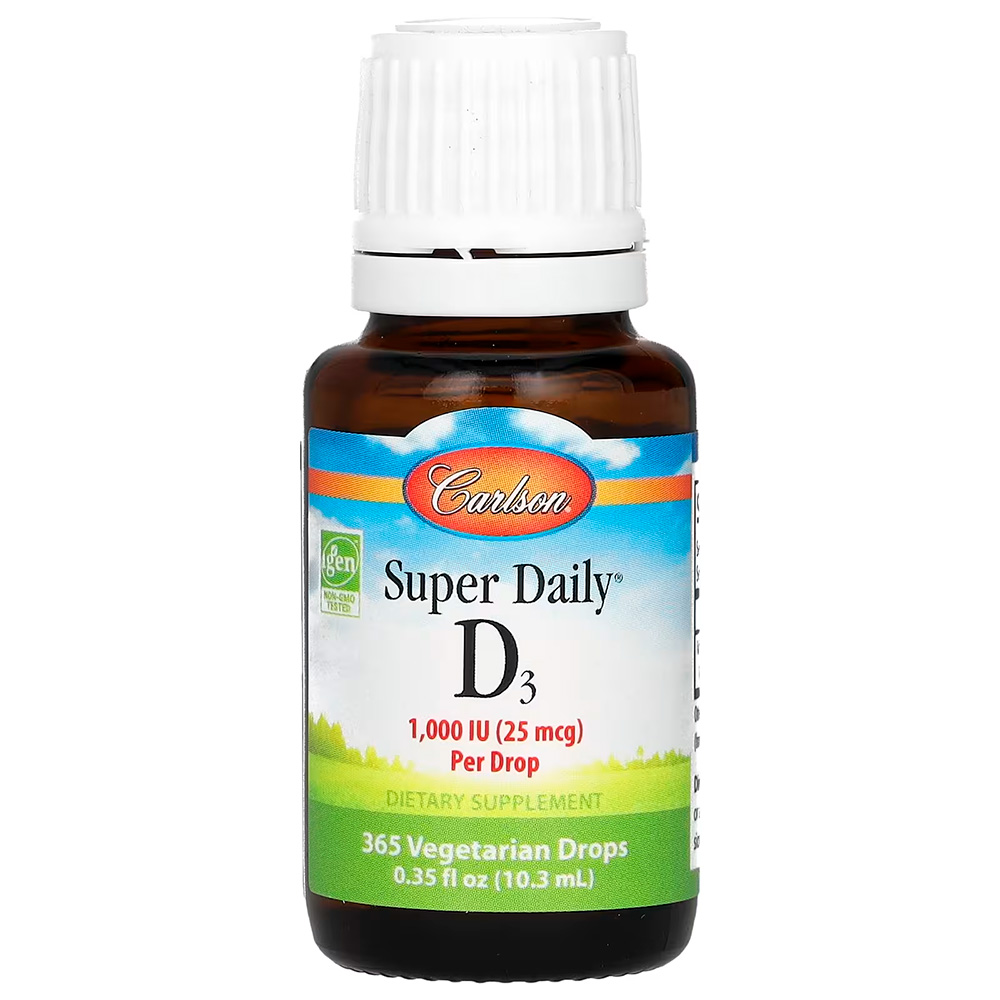 Витамин D3 играет важную роль для здоровья в целом. Однако для его выработки необходим солнечный свет, который не все получают в достаточном количестве. Super Daily® D3 от Carlson предлагает безопасный, быстрый и удобный способ получения витамина D3. Одна капля Super Daily® D3 содержит 1000 МЕ (25 мкг) концентрированного жидкого витамина D3.