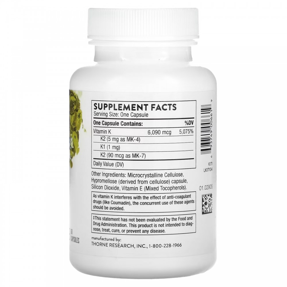 Витамин К от Thorne содержит три клинически изученные формы витамина К: витамин К1 и две формы витамина К2 (МК-4 и МК-7). Он содержит значительно больше МК-4, чем большинство других продуктов с витамином К, представленных на рынке.