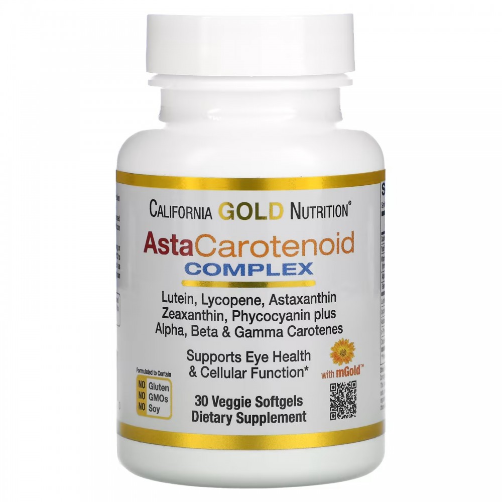Комплекс AstaCarotenoid от California Gold Nutrition содержит экстракт цветков бархатцев mGold ™ и другие экстракты антиоксидантов премиального качества в растительных капсулах. Он не содержит глютена, ГМО и сои и подходит для вегетарианцев и веганов.